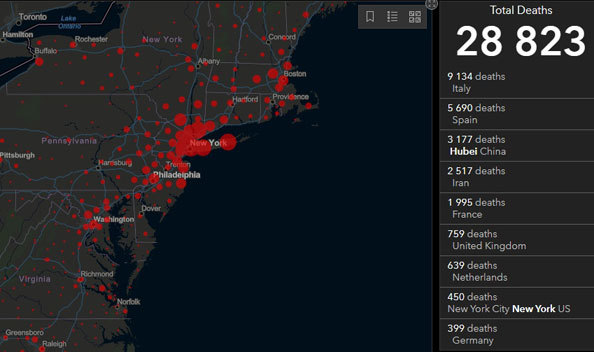 Il s’agit d’une carte réalisée par une université américaine : Johns Hopkins University. En fait, bien plus qu’une simple carte, c’est un véritable tableau de bord interactif qui fournit une grande quantité d’information sur l’évolution du covid-19.